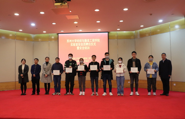 2021年11月18日晚,苏州大学纺织与服装工程学院实验室安全培训暨安全员聘任仪式在炳麟图书馆学术报告厅开展。纺织与服装工程学院党委书记肖甫青,现代丝绸国家工程实验室副主任刘欣亮,学院团委书记蒋闰蕾,总实验室副主任祁宁,专职安全员银华,兼职安全员魏兴,以及学院各实验室安全员、2021级研究生参加了培训。培训由学院副院长严俊主持。