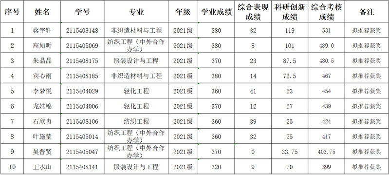 根据《苏州大学全日制本科生奖助学金管理办法(2019修订)》、《苏州大学全日制本科生校设奖学金评定实施细则(2019年修订)》以及《纺织与服装工程学院本科生奖学金评定实施细则(2023修订)》文件等有关规定,经个人申请,奖学金审核小组审核,奖学金评审工作组审议,拟评定出2023年纺织与服装工程学院苏美达奖学金推荐人选共计10名,现将名单予以公示,具体信息如下: