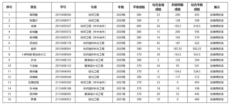 根据《苏州大学全日制本科生奖助学金管理办法(2019修订)》、《苏州大学全日制本科生校设奖学金评定实施细则(2019年修订)》以及《纺织与服装工程学院本科生奖学金评定实施细则(2023修订)》文件等有关规定,经个人申请,奖学金审核小组审核,奖学金评审工作组审议,拟评定出2023年纺织与服装工程学院正雄奖学金推荐人选共计16名,现将名单予以公示,具体信息如下: