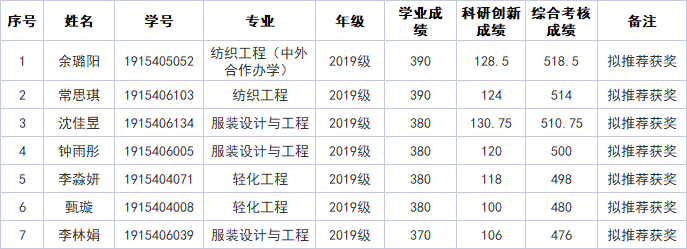 根据中国纺织工业联合会《关于推荐“纺织之光”2022年度中国纺织工业联合会教师奖和学生奖候选人的通知》(中国纺联函〔2022〕8号)文件精神以及《纺织与服装工程学院奖学金评定实施细则(2022年修订)》,经个人申请,奖学金审核小组审核,奖学金评审工作组审议,拟推荐以下7名本科生同学获得2022年“纺织之光”学生奖。现将名单予以公示,具体信息如下: