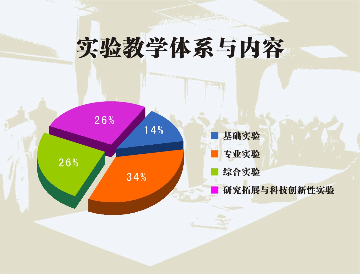 综合实验:64项,占26%。在第6~第7学期完成,以开放实验室的形式,通过工艺设计、产品的设计与试制等方式,使学生系统掌握纺织产品设计开发全过程的实验内容和手段。